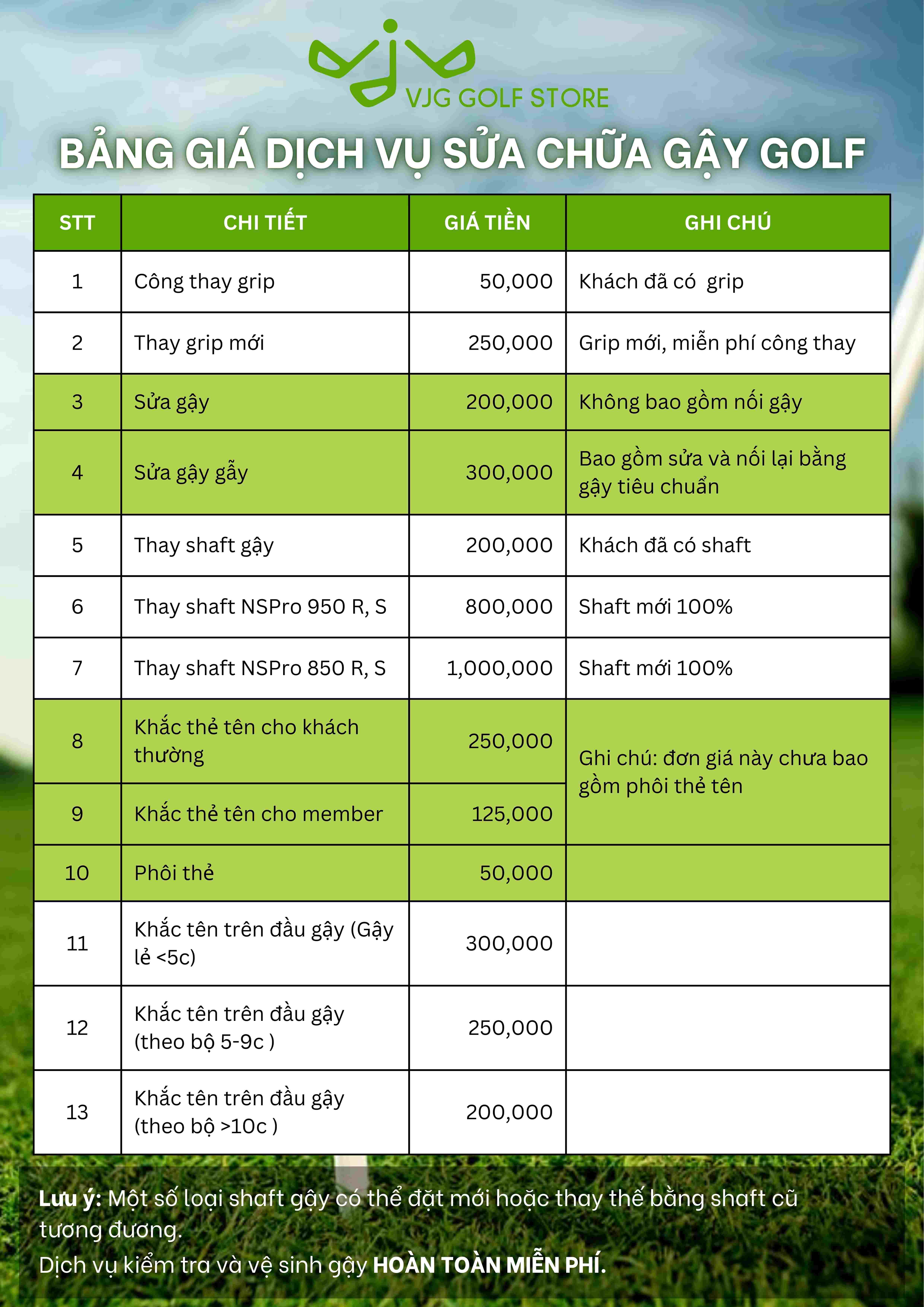 Đặc biệt, tại VJG Golf Store, các dịch vụ kiểm tra và vệ sinh gậy golf đều MIỄN PHÍ. Chất lượng và sự hài lòng của khách hàng luôn là ưu tiên hàng đầu khi các Quý golfer đến với VJG Golf Store.